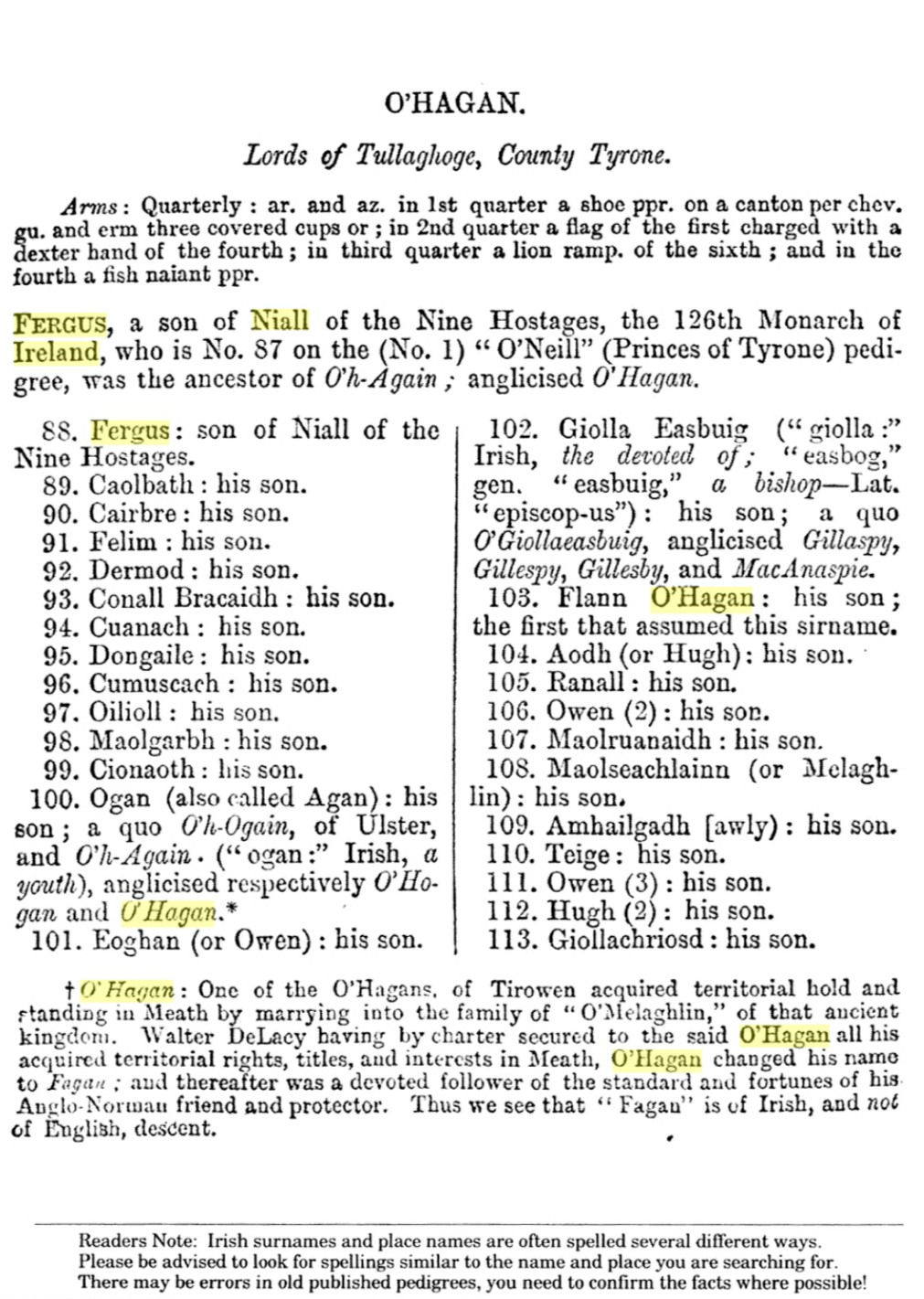 Fergus > Eogan mac Neill > Fergus > Caolbath > Caibre > Felim > Dermod > Conall Bracaidh > Cuanach > Dongaile > Cumuscach > Oilioll > Maolgarbh (splits here to O'Cuinn/O'Quinn sept) > Cionaoth > Ogan, also called Agan, son O'h-Ogain anglicised to O'Hogan and son O'h Again, Ó hAodhagáin, anglicised to O'Hagan.