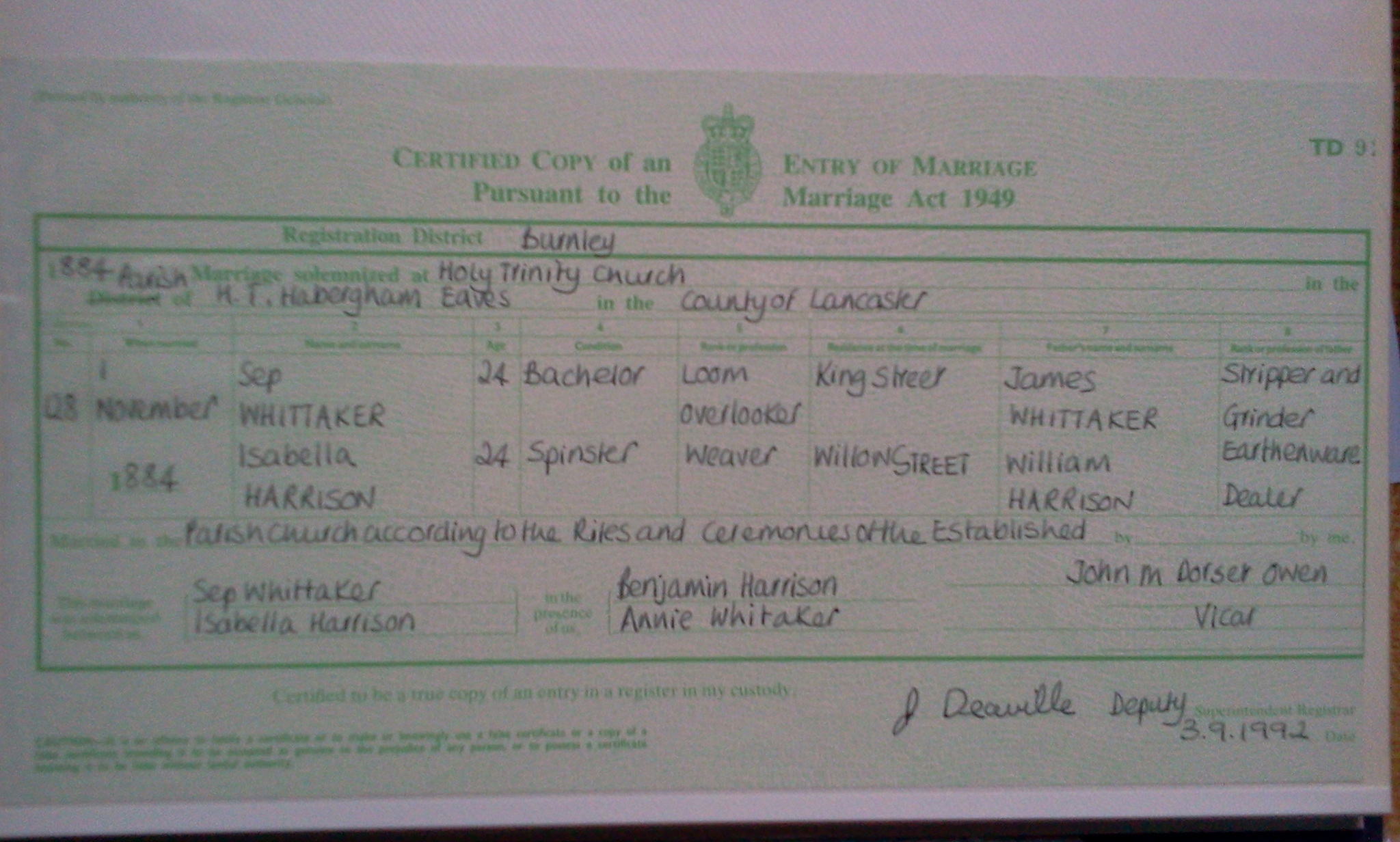 - Nancy Demaine married William Harrison on 14 January 1860 in The Parish Church, Barnoldswick, Yorkshire. Nancy (parents James Demaine and Elizabeth Rimmington) was born 29 Mar 1839 in Hunslet, Leeds, Yorkshire, England). Chrispin Demaine whose relationship is unknown appears as a witness on the marriage certificate.