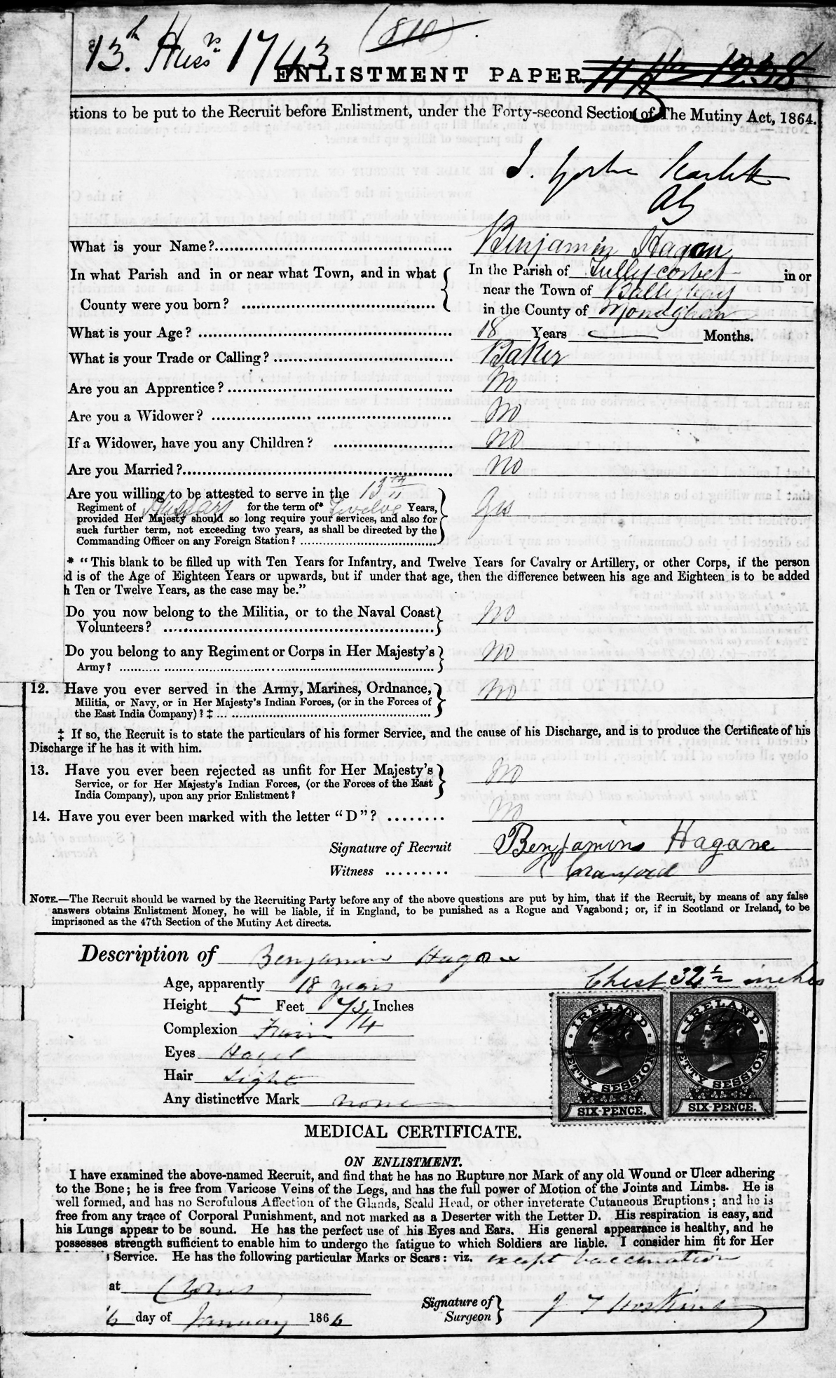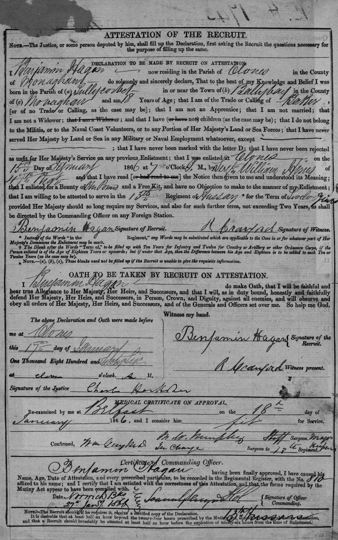 He enlisted to the 13th Hussars at Clones in January 1866. He gave his age as 18 years old. His service lasted 20 years and he visited many countries including South Africa. Before my grandfather, died e gave me a sword fish saw and a whip made from solely a tree (shrub)branch. He said his father gave it to him from Africa. His military history document of March 1886 gave his next of kin his mother Sarah Ann of Belfast, County Antim and his brother John of Dublin Street, Monaghan.His father, John is not recorded so perhaps he died prior to 7 November 1881, even before 1870.