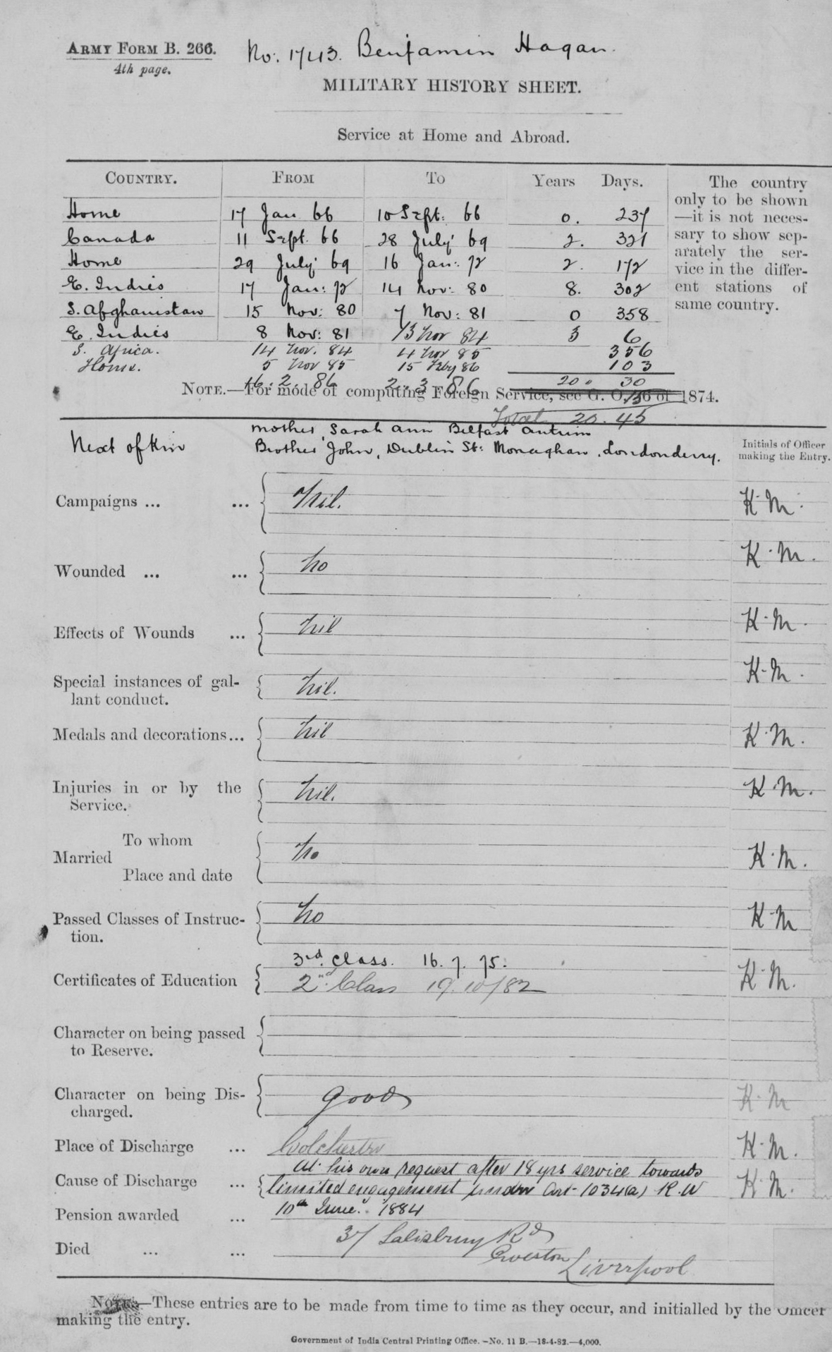 16 Feb 86 - 2 Mar 1886 discharged after 20 years 45 days